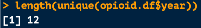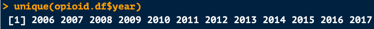- Example: The unique years in the opioid.df data frame are shown below