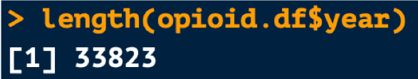 - Example: The year column within opioid.df has 33,823 values