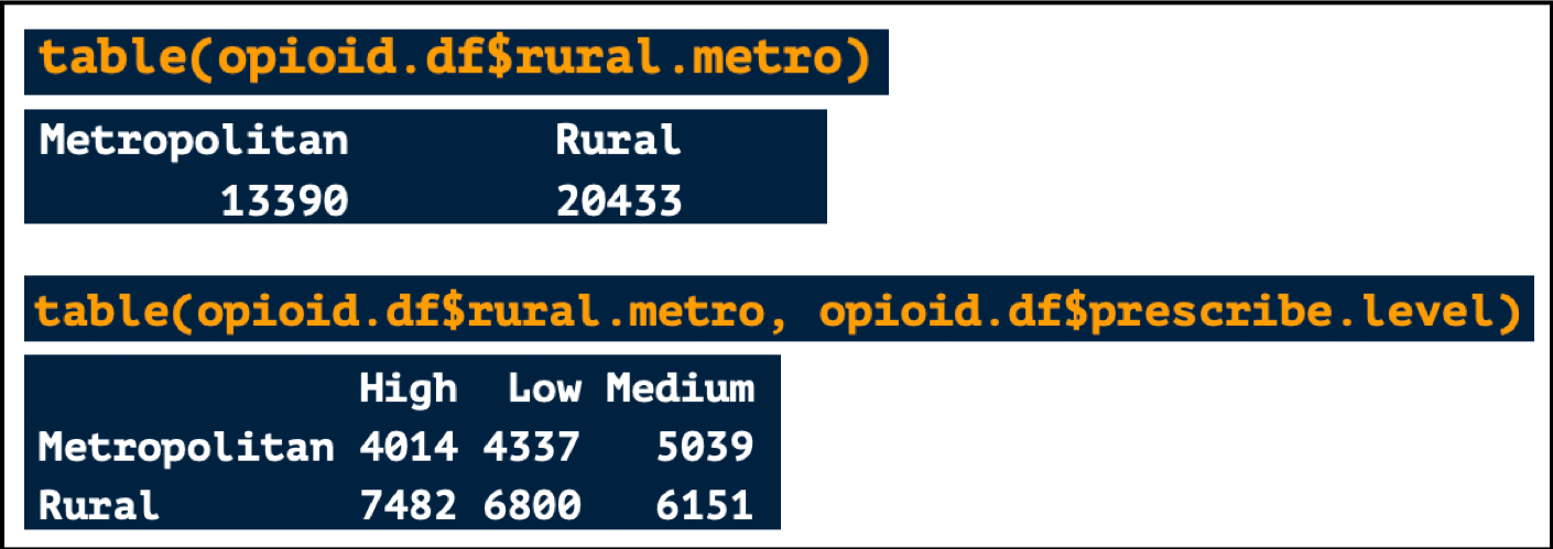 - For example, above you see that there were 13390 Metropolitan counties and 4014 Metropolitan counties with a high prescribing rate