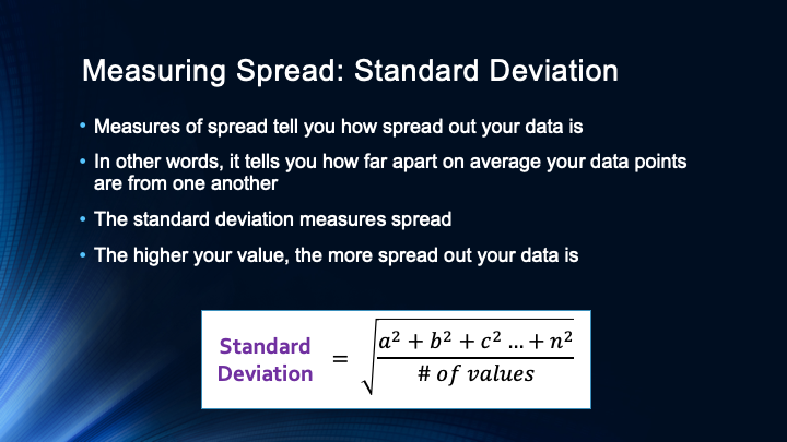 The video below reviews the measures of spread: standard deviation and interquartile range. It also reviews common data shapes.