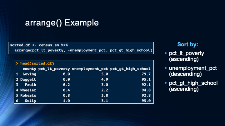 This video demonstrates how to use the dplyr arrange() function in R, which sorts data with a much simpler syntax than in base R.