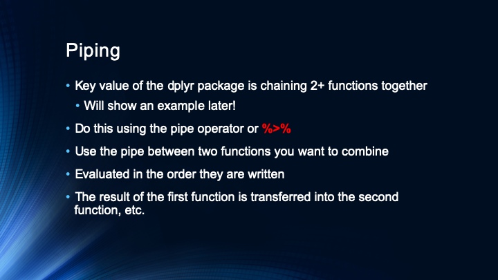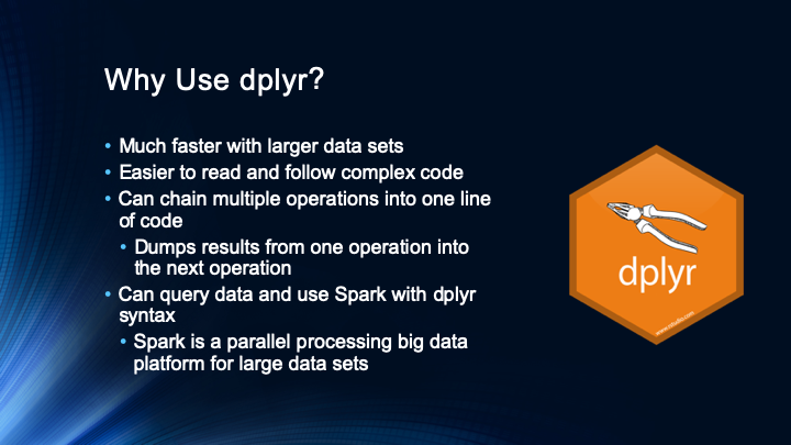 September 19, 2019January 6, 2020 khuntzberry What Is dplyr? This video explains what the dplyr package is and why you should use it. It is easy to read, simple, consistent, and fast! Code and Data Available Here Slides Related