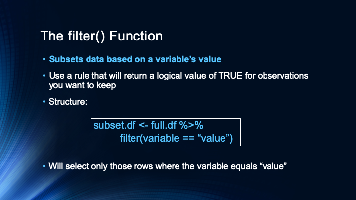 This video reviews how to use the filter() function in the dplyr package. This function allows you to subset data based on column values.