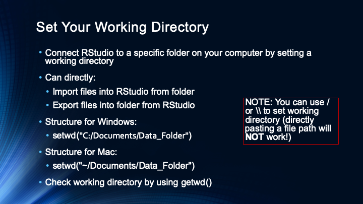 This video covers how to set your working directory, which is similar to a “default” folder. Your files will automatically be imported and exported from this folder.