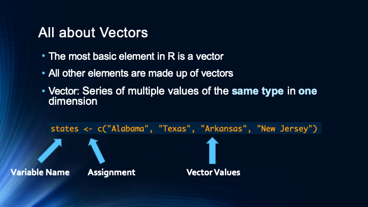 October 21, 2019January 6, 2020 khuntzberry Vectors This video explains the concept of vectors and how to build them in R. Code and Data Available Here Slides Related