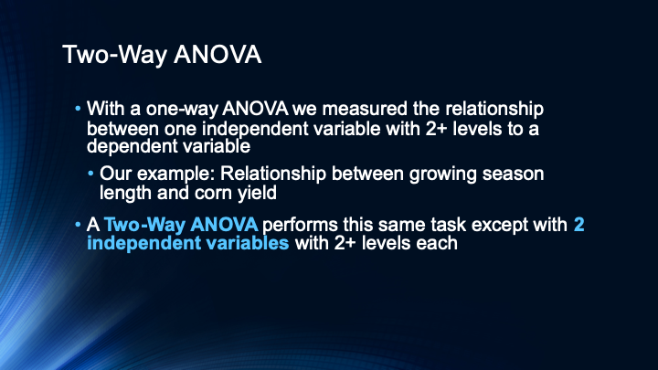 This video gives an overview of the two-way ANOVA method and how it is run in R. I then walk through an example showing how you would code and interpret the results in a two-way ANOVA example.