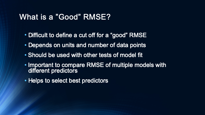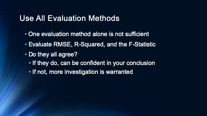 This video explains the metrics used to evaluate linear models such as root mean square error (RMSE), r-squared, and f-statistic. I cover how you use these metrics together evaluate model accuracy.