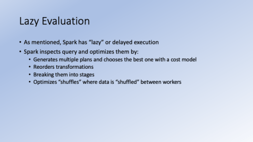 In this session we cover ways to optimize PySpark code. This includes descriptions of situations where slowness may occur, for example, uneven partitions and skewed joins. To combat these issues I explain repartitioning/coalescing and broadcast joins. I also explain how to place your data in memory or on disk to cache commonly used data sets. Finally, I show the interface where you can monitor memory and CPU usage to make sure you are using the optimal cluster size.