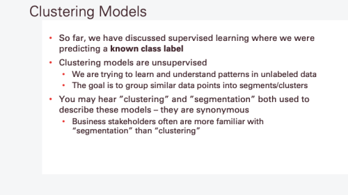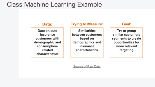 In this class I cover the basics of clustering models to perform tasks like customer segmentation. First, I give an overview about what clustering is and why we would use it. I introduce several use cases where these methods could be used. I then cover the basics of the K-Means method and give an example of an insurance customer segmentation use case. This example uses the Python package scikit-learn.