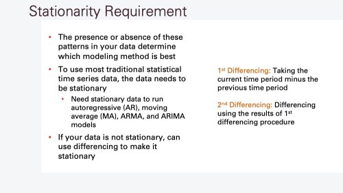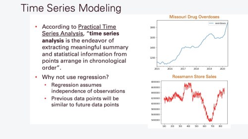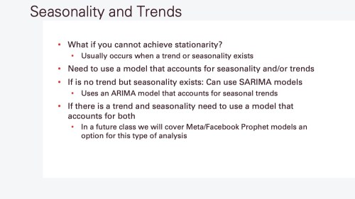 In this class we will cover the basics of time series modeling. First, we will focus on time series assumptions such as stationarity and autocorrelation. Then we will focus in this class on AR, MA, ARMA, and ARIMA models and when to use each type of model.