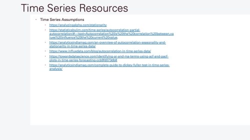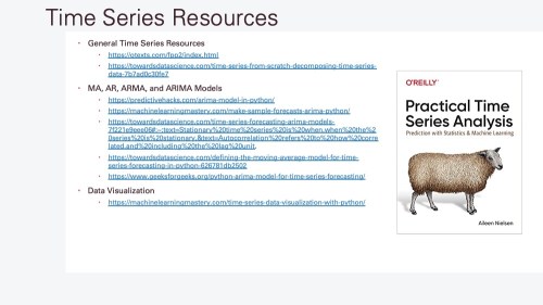 - Practical Time Series Analysis by Aileen Nielsen: Chapter 3, Time Series-Specific Exploratory Methods Section; Chapter 6