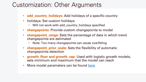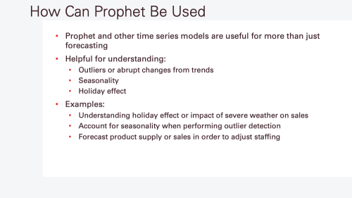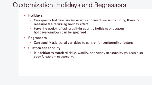 - Time series decomposition (trends, seasonality, and holidays)